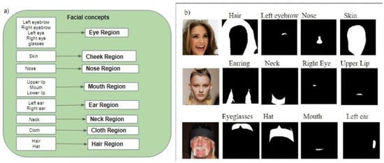 Deepfake Face Dictionary. (a) Facial Concepts and corresponding regions from the dictionary. (b) Samples of images and respective segmentation masks for facial concepts.