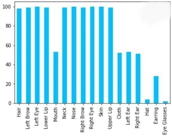Our deepfake face dictionary includes 17 facial concepts and a group of corresponding images for each facial concept. The images are obtained from the CelebAMask-HQ dataset, which is a large-scale dataset including masked face images []. Each image contains a segmentation mask of facial features corresponding to the CelebA dataset. The masks of the images were manually annotated and included facial concepts with 19 classes. Among them, the labels that were used in the proposed work are nose, skin, ears, eyes, lip, hair, mouth, hat, neck, earrings, eyeglasses, and cloth. Figure 7 depicts some examples of facial concepts and their respective masks from the deepfake face dictionary. Overall, there are 100 individual images and 1238 masked images corresponding to various facial concepts. The graph in Figure 8 shows the histogram of the number of labeled occurrences for each facial concept present in the deepfake face dictionary.