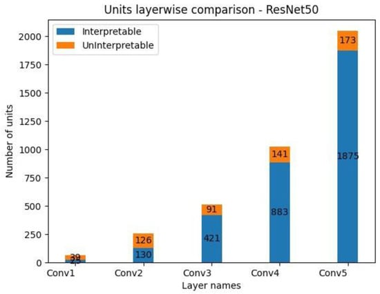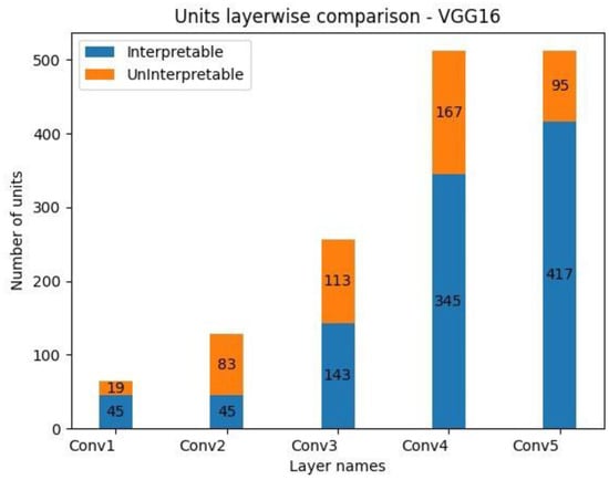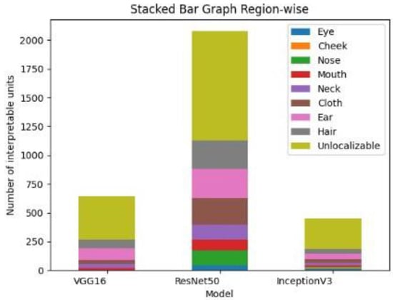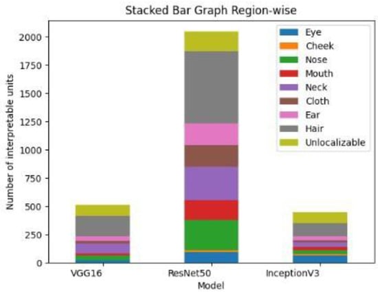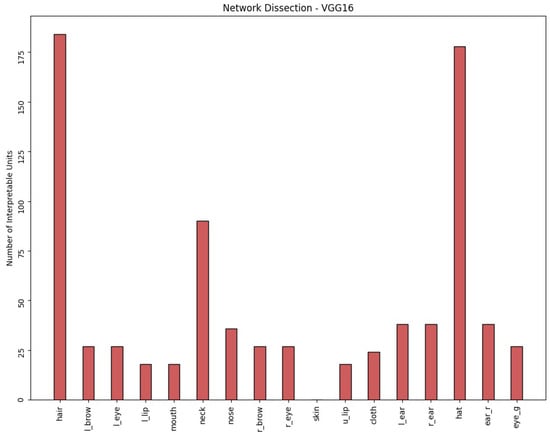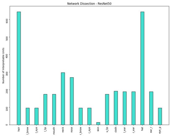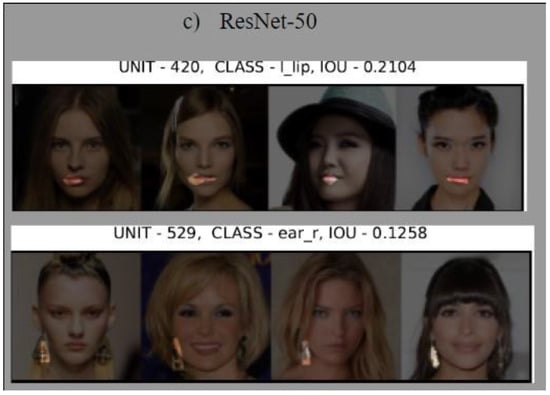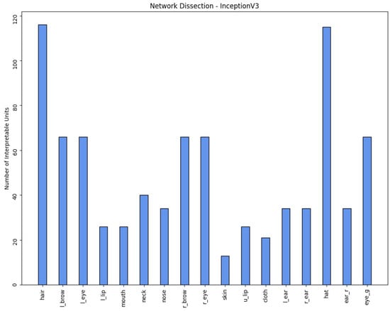 Table 1 provides a summary of the models that were dissected, outlines the layer that was dissected during the experiments, and depicts the results for each model. These interpretability experiments focused on the deeper layers of the models, as previous studies have shown that high-level concepts are primarily located in the layers closer to the output and the face dictionary consists of higher-level concepts. The performance metric used to test the explainability of these CNN models is the intersection over union (IoU) score, which is given in Equation (1).