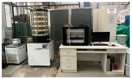 This paper mainly studies the long-term deformation and energy dissipation law under cyclic loading for the surface layer and bottom layer of high-speed railway subgrade. The test was carried out using a large diameter triaxial test system, as shown in Figure 1. It includes a dynamic loading system, pressure chamber, confining pressure control system, data acquisition and control operation system, etc. The dynamic loading system is controlled by the closed loop of the servomotor. The axial force is 0~64 kN; the frequency is 0~5 Hz. The displacement stroke and control accuracy are ±100 mm and 0.20 μm, respectively. The pressure chamber is suitable for triaxial specimens with a maximum diameter of 300 mm, to meet the requirements for the configuration size of coarse-grained soil specimens.