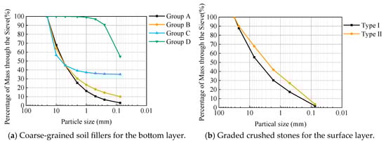 The triaxial specimens used in the test were prepared according to the typical coarse-grained soil filler grading of high-speed railway subgrade in China. According to the code for the design of railway ground structures (TB 10001-2016) [], the grading curves of filler specimens were determined, including type I- and type II-graded crushed stones for the surface layer of subgrade and group A, B, C, and D fillers for the bottom layer of the subgrade bed, with a total of six types of grading curves. The triaxial specimen used in the test was 150 mm in diameter and 300 mm in height. According to the requirement that the maximum particle size not be greater than 1/6~1/5 of the sample diameter, the equivalent substitution method was used to adjust the particle grading of the original soil sample, and the maximum particle diameter was set as 20 mm. The grading curve for each group is shown in Figure 2. The samples were mixed according to the grading requirements and were sealed and cured for 24 h to ensure a uniform water content, then the samples were compacted in five layers in the membrane cylinder. According to the compaction standard for the subgrade bed of a high-speed railway [], the moisture content of the sample was configured according to the optimal moisture content, and the compaction degree was controlled by 0.97 of the surface layer and 0.95 of the bottom layer in the subgrade bed.