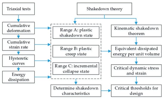 The research framework is shown in Figure 3. The blue arrow indicates the sequence of the research methods used and the source relationship of the results. The dotted box represents the set of three types of shakedown states, which can be obtained from the test results and shakedown analysis.
