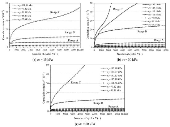 Under different dynamic stress amplitudes, there are obvious differences in the cumulative law of the permanent strain of the filler. To be specific, for Range A, when the dynamic stress amplitude was small enough, the accumulation curve remained stable for a long time after a small amount of strain accumulation in the initial several cycles, and no new deformation accumulation occurred. For Range B, with the gradual increase in the dynamic stress amplitude, the development rate of the strain increased gradually. In this process, new deformation accumulation occurred in each external load cycle, and the permanent deformation showed a continuous and slow growth trend. For Range C, when the dynamic stress amplitude exceeded a certain limit, the permanent deformation curve showed an upward trend, a large cumulative strain occurred in a very short time (εp > 5%), and the sample was damaged. According to the development trend of cumulative strain, even at small stress levels, all samples showed plastic strain, which indicated that the actual working state of railway subgrade filler was usually not a purely elastic state.