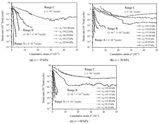 Corresponding to the cumulative strain, the strain rate can further reflect the development trend and different stable states of the above three types of strain accumulation. The variation in strain rate with cumulative strain under different dynamic stress amplitudes is shown in Figure 5. The strain rates of specimens were also divided into three ranges. Taking the result of confining pressure σ3 = 30 kPa as an example, the strain rate in Range A decreased rapidly with the increase in accumulated strain, reaching below 1 × 10−5/cycle, without continuous deformation accumulation. The strain rate in Range B decreased as the accumulated strain increased, with a certain deflection at the end of the curve, and finally stayed between 1 × 10−3~1 × 10−4/cycle. The strain rate in Range C decreased slightly with the increase in accumulated strain and finally maintained at a high level (0.1~0.01/cycle). With the continuous increase in permanent deformation, the rate further increased and finally the cumulative strain exceeded the maximum strain (5%), which was considered as having reached a critical state.