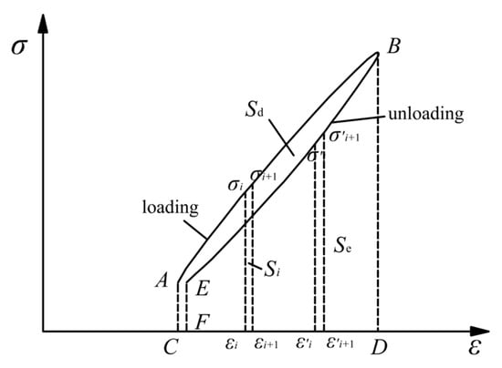 where U is the total unit volume energy, Ue is the unit volume elastic energy, σ and ε are the stress and strain of the loading section, σ′ and ε′ are the stress and strain of the unloading section, and σi and εi are the stress and strain of segment i after discretization.