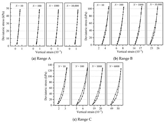 The typical stress–strain hysteresis curves are in accordance with the three dynamic shakedown states, as shown in Figure 8. For Range A, the shape of the hysteretic loop at each stage was approximately linear, and the stress–strain relationship showed elastic behavior. This indicated that there was almost no new plastic dissipated energy generated in each cycle. For Range B, the shape of the hysteresis loop presented a thin crescent shape with a small hysteresis loop area. A certain amount of plastic dissipated energy was generated in each cycle, but the overall shape of the hysteresis loop did not change with the development of the loading stage, indicating that the cumulative incremental rate of plastic strain was a relatively stable constant. For Range C, the hysteresis loops at each stage exhibited a wide crescent shape, with a strongly nonlinear stress–strain relationship. The hysteresis loop area was large, and the deformation of the specimen accumulated rapidly.