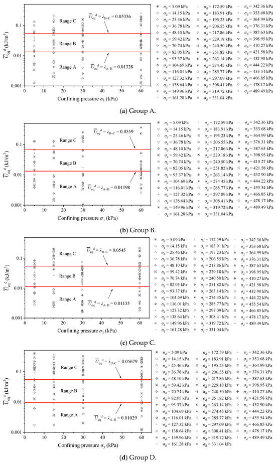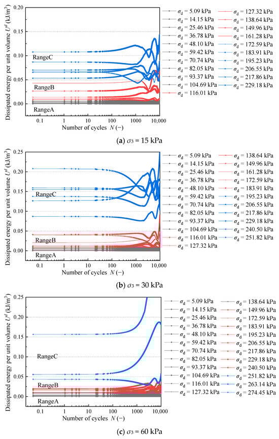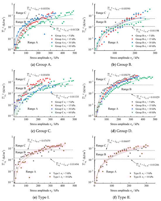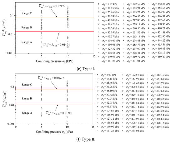 The relationship curves between the equivalent dissipated energy per unit volume and dynamic stress amplitude are shown in Figure 11, and the criterion lines for judging the critical value are marked in the figure (shown by the dotted lines). The intersection of the curve and the critical line represents the critical point of the shakedown critical state, that is, the thresholds of stress amplitude for Range A, B, and C under the corresponding confining pressures.
