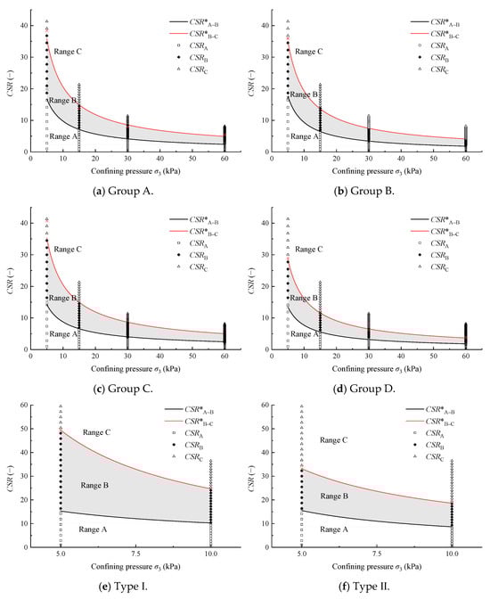 By substituting the critical value of dynamic stress amplitude σd in Figure 9 into Equation (7), the threshold curve of CSR*A–B and CSR*B–C can be obtained. As shown in Figure 13, the data points CSRA at the lower left of the CSR*A–B threshold curve are in the plastic shakedown state, the data points CSRC at the upper right of the CSR*B–C threshold curve are in the incremental collapse state, and the data points CSRB in the shaded area between CSR*A–B and CSR*B–C are in the plastic creep state.