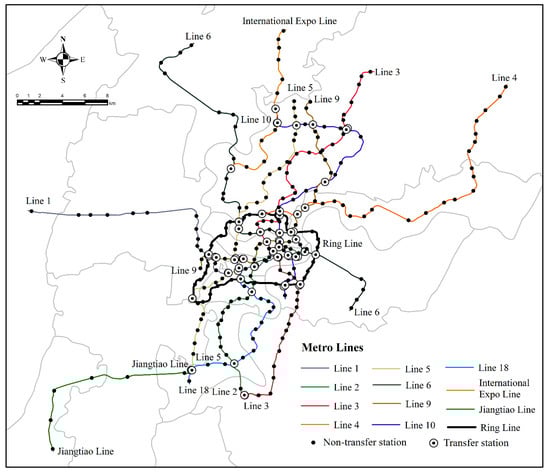 Chongqing is a megacity located in southwestern China, with a population of 31.9 million and a GDP of RMB 3014 billion (about USD 412.9 billion). The Chongqing metro network is one of the largest mountainous URT systems in the world, providing services to the 14 districts of Chongqing. By the end of 2023, it had opened Lines 1, 2, 3, 4, 5, 6, 9, 10, and 18, as well as the Ring Line, International Expo Line, and Jiangtiao Line, totaling 12 lines and 256 stations (Figure 1). The total operating mileage reached up to 538 km, with a peak daily passenger volume of 5.162 million, accounting for 54.28% of public transportation travel in the city [], which makes a significant contribution to alleviate traffic congestions and promote green travel.