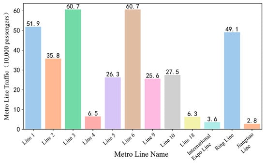 Figure 2 shows the daily ridership of each metro line, which is retrieved from the metro company. Lines 3 and 6 have the highest ridership, reaching 607,000 passengers per day, making them the backbone of the URT network. Following them, Line 1, which connects the east and west sides, and the Ring Line, which encircles the core urban area, exhibit relatively high passenger flows, underscoring their importance. In contrast, Lines 4, 18, the International Expo Line, and the Jiangtiao Line have the lowest ridership, each under 70,000 passengers, mainly due to serving suburban areas with the lower population density. Lines 2, 5, 9, and 10 have moderate ridership, with around 300,000 passengers per day. Overall, passenger volumes across the Chongqing metro lines show a clear hierarchical pattern, closely related to their geographic locations, service areas, and regional development, reflecting the varying capacities of each line to meet urban travel demands.