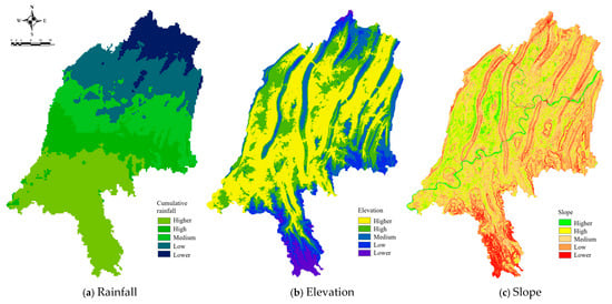 Spatial distributions of risk factors for extreme rainfalls in Chongqing urban area.