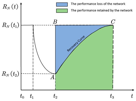Here, service resilience is defined as the ratio of the accumulated performance retained by the network from the moment of node failure to the moment of returning to normal, to the accumulated performance of the network over an equivalent duration under normal conditions. That is, service resilience is the ratio of the green area to the sum of the blue and green areas in Figure 5.