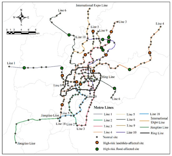 Based on the classification results in Section 2, 10 stations in high-risk areas were selected as high-risk ones as shown in Figure 6. The high-landslide-risk stations are pretty scattered, primarily along Lines 5, 1, and 9. Among them, Daping Station is a representative station for landslide disasters. Daping Station has the highest passenger flow and topological importance index, indicating its significance within the network.