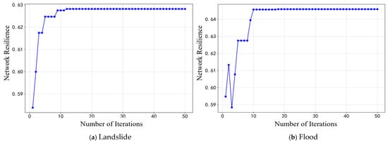 The optimization process is illustrated in Figure 7. It shows the optimization process of the network recovery strategy as the number of iterations increases. In the landslide disaster scenario (Figure 7a), the genetic algorithm converged to the optimal solution after the 12th iteration, demonstrating good convergence and suitability for the metro network topology model constructed in this paper. The maximum network resilience value was 0.628, with the corresponding optimal recovery node sequence being Gaofeng Lake, Huanshan Park, Daping, Gailan Creek, Fuhua Road, Ciqikou, Yuegang North Road, Huxia Street, Zhongliang Mountain, and Sanban Creek. In the flood disaster scenario (Figure 7b), the genetic algorithm converged to the optimal solution after the 10th iteration, with a maximum network resilience value of 0.646. The corresponding optimal recovery node sequence was Bijin, Baosheng Lake, Liujiaping, Xingke Avenue, Luqi, Shuangbei, Shuangfeng Bridge, Lushan, Xiangjiagang, and Jiandingpo.
