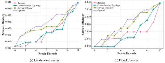 Based on the established recovery time relationships and the recovery order in Table 3, the temporal variation curves of network service efficiency under four recovery strategies—random repair, topology-based importance, service efficiency index, and resilience optimization—were calculated. Figure 8 illustrates the dynamic changes in the service efficiency temporal variation curves under the impacts of landslide and flood disasters.