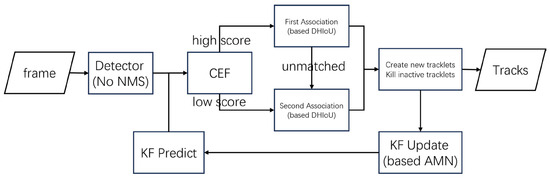 The workflow of our method: the video frames are input into a detector in which NMS does not work, and then the output is input along with the KF prediction results into the CEF module to obtain the filtered detection boxes. After that, these boxes are matched twice with the KF prediction results using DHIoU. Finally, based on the matching results, the tracklets are managed and KF-AMN updates are performed.