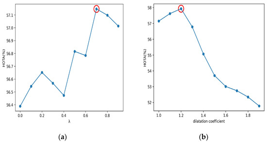 The selection of weight parameters. In Figure (a), the x-axis represents the parameter selection, while the y-axis displays the HOTA evaluation metric. A higher HOTA value indicates better performance of the selected parameter, and the figure demonstrates that when , the HOTA result reaches its peak, indicating that this is the optimal parameter. Similarly, in Figure (b), when , the HOTA result reaches its peak, indicating that this is the optimal dilatation coefficient. The best results are highlighted with a red circle.