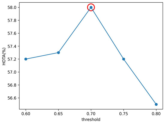 After obtaining the overlap rates for the tracked object predictions, we used this information to dynamically set thresholds for filtering detection candidate boxes. First, we identified the closest prediction box for each detection box and then assigned the overlap rate represented by the prediction box to the threshold vector. Specifically, if the overlap rate of the detection box exceeded 0.7, we set to that overlap rate; otherwise, we assigned it a fixed threshold, and Figure 3 shows that the fixed threshold of is the optimal parameter. As a result, we obtained a threshold vector of length , and the calculation process can be expressed by Equations (4) and (5):