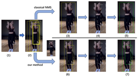 The figure illustrates the workflows of two different methods. The yellow boxes in (2) represent the detection candidate boxes before NMS is applied. The first row demonstrates the processing flow of the classical NMS: the yellow box in (3) indicates the detection box resulting from applying NMS to the detection candidate boxes in (2). Due to significant overlap between the boxes, (3) ultimately retains only one detection box for the frame. The white boxes in (4) show the object position predicted by the Kalman filter., The green box in (5) represents the result of associating the detection box from (3) with the prediction boxes from (4), successfully associating only one object trajectory. The second row showcases the workflow of our method: the yellow boxes in (6) indicate the detection boxes resulting from our method applied to the detection candidate boxes in (2), successfully detecting two objects. The green boxes in (7) represent the result of associating the detection boxes from (6) with the prediction boxes from (4), successfully associating both objects.