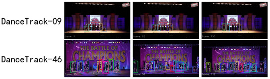 A visualization of the tracking results on the DanceTrack test dataset. Boxes of the same color and the numbers in the upper-left corner of the boxes indicate the same tracking object. The frame number in the lower-left corner shows the frame index of the image in the video.