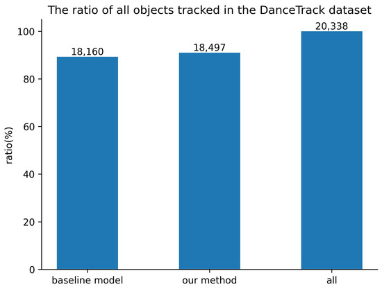 We counted the total number of objects appearing in frames with object overlaps () in the DanceTrack dataset, totaling 20,338 objects. In these overlapping scenarios, our method successfully tracked 18,497 objects, achieving a success rate of 91.0%; in contrast, the baseline model successfully tracked 18,160 objects, with a success rate of 89.2%.