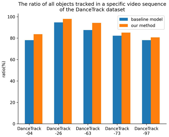 We present a comparison of the tracking success rates between our method and the baseline model for specific video sequences in the DanceTrack dataset. In the DanceTrack-04 sequence, our method tracked 83.6% of the objects, while the baseline method tracked only 78.1%. In the DanceTrack-26 sequence, our method tracked 97.9% of the objects, while the baseline method tracked 94.1%. In the DanceTrack-63 sequence, our method tracked 94.2% of the objects, while the baseline method tracked only 87.5%. In the DanceTrack-73 sequence, our method tracked 85.1% of the objects, whereas the baseline method tracked 82.3%. Finally, in the DanceTrack-97 sequence, our method tracked 80.7% of the objects, while the baseline method tracked 78.1%.
