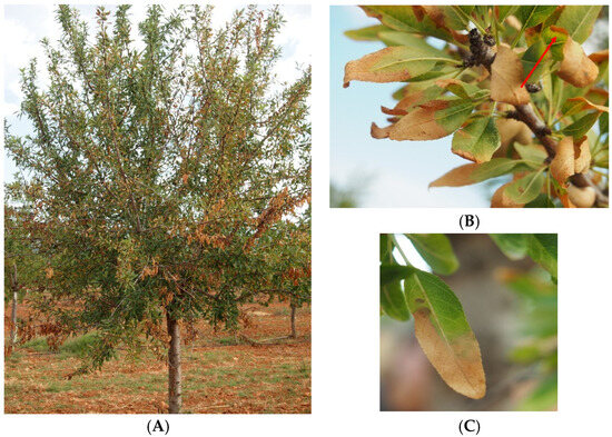 (A) Infected almond tree in Mallorca orchard with ‘golden death’ symptoms; (B) scorch symptoms on almonds with the typical yellow band, marked with a red arrow; and (C) on the leaf tissue between the green and dead areas.