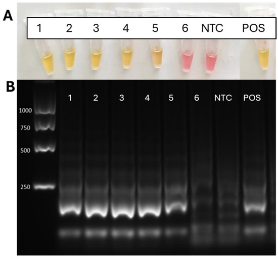 (A) cLAMP reactions from healthy almond sap spiked with 10-fold serial dilutions of Xfm ESVL cells, from 106 to 10 CFU/mL (1–6; NTC: no template control; Pos: positive control); and (B) amplified products of each dilution analyzed by gel electrophoresis.