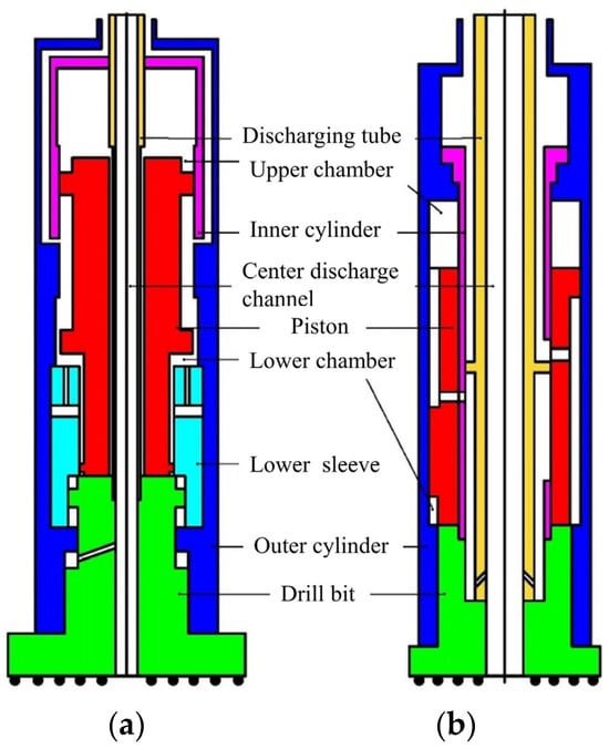 As depicted in Figure 2, the valve structure of the DTH hammer is categorized into two distinct types based on the direction of compressed air entering the cylinder as follows: the internal flow structure and the outflow structure. In the outflow piston structure (Figure 2a), compressed air is directed into the cylinder either through the outer tube or via a valve rod separate from the outer tube. Upon reaching a predetermined stroke, the piston’s unique external contour design is engineered to either seal or expose the flow channel’s inlet and outlet. This mechanism facilitates the transfer of high-pressure gas between the upper and lower chambers of the cylinder, thereby enabling the switching action necessary for the hammer’s operation. However, the outflow piston design features slots only on the outer ring of the piston, resulting in a relatively stable overall structure. This design necessitates the structural collaboration with the outer cylinder of the DTH hammer. Consequently, it tends to exhibit areas of structural weakness, and the surface area available for compression is also restricted. In the internal flow piston design (Figure 2b), the compressed air is channeled into the cylinder either through the inner tube or via a valve rod that is distinct from the inner tube. The air distribution channel is integrated within the piston. At a specific stroke point, the configuration of the inner tube and the piston’s flow channel undergoes a change, facilitating the transition of high-pressure gas between the cylinder’s upper and lower compartments. The internal flow piston structure works in tandem with the valve rod, thereby diminishing the need for structural coordination with the outer cylinder. This design also optimizes the area of the compression surface, maximizing its effective size. The comparative analysis of the two structures reveals that the internal flow piston design boasts superior impact energy and structural integrity. It holds the potential for enhancing efficiency and extending the service life of the RC-DTH hammer during drilling operations in complex geological settings.