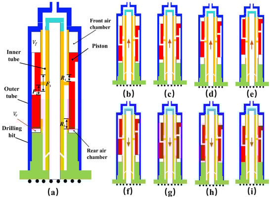 Impact process of the RC-DTH air hammer. (a–e) Represent the backhaul phase and (f–i) represent the stroke phase; the end of (e) can be regarded as the initial stage of the stroke phase and the end of (i) as the initial stage of the backhaul phase.