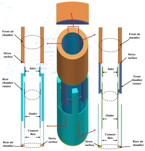 Figure 5 illustrates the model subdivided into several key regions according to different basin properties as follows: the upper cavity, lower cavity, inlet flow channel, outlet flow channel, and the fluid within the piston’s inner flow channel. In order to increase the calculation accuracy and reduce the calculation time, the grid of each basin is divided into the hexahedral grid under a fine design, and the total number is 1.795 million. A circular cylindrical, penetrating layer with a thickness of 0.01 mm is introduced between the channels to ensure the convergence of the fluid continuity equation during computation. While the piston moves, the fluid within the upper and lower cavities experiences either compression or tension. The lower end face of the upper cavity and the upper end face of the lower cavity serve as the load-bearing surfaces. The fluid in the piston’s flow channel is associated with a moving grid, while the upper and lower cavities are represented by deformation grids. The fluid within each domain synchronizes with the piston’s movement. The surface grids within each region are designated as the stress surface, deformation surface, wall, interface, inlet, and outlet. Ideal gas is used to simulate the internal fluid of the piston, whose parameters are shown in Table 2.