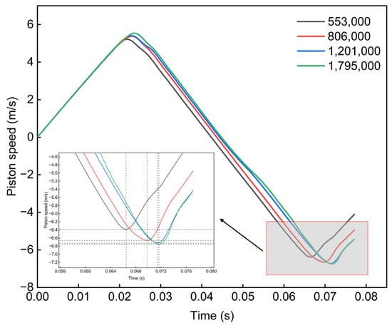In the process of grid independence verification, the fluid domain was divided according to different mesh sizes, and the following four different mesh numbers were obtained: 553,000, 806,000, 1.201 million, and 1.795 million. Then, the variation trend of the final impact velocity of the plunger piston under different mesh numbers was analyzed. As shown in Figure 6, different mesh numbers have certain effects on the final impact velocity and impact frequency of the hammer. When the mesh number is close to 1.795 million, the final impact velocity of the piston and the time required to reach its velocity are very close, and the calculated results tend to be stable. When the number of grids reaches about 1.8 million, the effect of the number of grids on the calculation results is almost negligible.