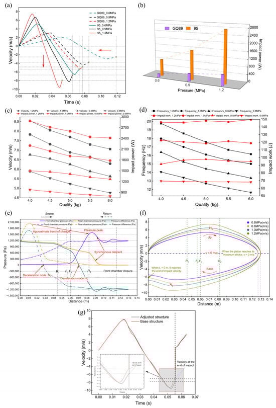 Profiles obtained by CFD simulations. (a) Velocity and time curves of two types of hammers under different inlet pressure conditions; (b) impact power under different inlet pressure conditions; (c) influence of RC-DTH hammer quality on impact final velocity and impact power; (d) influence of DTH hammer quality on impact frequency and impact work; (e) correlation between the gas pressure in the upper and lower chambers of the piston with the stroke; (f) correlation between piston motion velocity with piston stroke; and (g) comparison of impact velocity before and after piston structure adjustment.