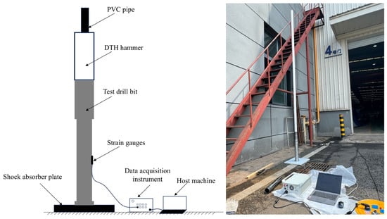 To validate the accuracy of the simulated piston impact energy for the Type B RC-DTH air hammer, an experimental setup was constructed to measure the actual piston impact energy. The impact performance testing system, designed using the stress wave technique, consists of the following two main components: a data acquisition and analysis system and a drilling rig system. The drilling rig system is made up of a drilling apparatus, an air compressor, a damping plate, and a specialized test bit. The data acquisition and analysis system are equipped with instruments for capturing stress waves and oscillographic data, a host computer, dedicated analysis software, and a strain gauge for precise measurements.
