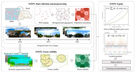Green visibility is an indicator used to measure the green spaces that residents observe during their daily physical and social activities. To effectively identify changes in visibility and their effects on the fairness of green distribution among residents, we developed an evaluation framework to visualize spatial equity. In the first step of this framework, we collected residential POI data and temporal street view images. A residential hexagonal grid was constructed, aggregating residential areas within each hexagon to its centroid as demand points. In the second step, we used deep learning to extract GVI from street view images and applied buffer analysis to calculate green visibility, which served as supply points. In the third step, we assessed the overall and local equity of green visibility using the Gini coefficient, Lorenz curve, and location quotient. Based on the results, we proposed recommendations for optimizing green space distribution and improving urban greenery planning (Figure 1).