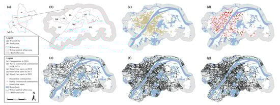 Location of the study area (a,b), distribution of residential communities (c,d), and street view sampling points (e–g).