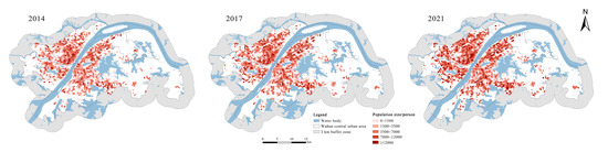 Figure 5 shows that the population size and density of residential areas experienced significant growth from 2014 to 2021, with a consistent pattern of population clustering across the three time points. High population density areas are primarily concentrated along the banks of the Yangtze and Han rivers, particularly in the southern parts of the JH District and the JA District, the southeastern part of the QK District, and the northern part of the WC District.