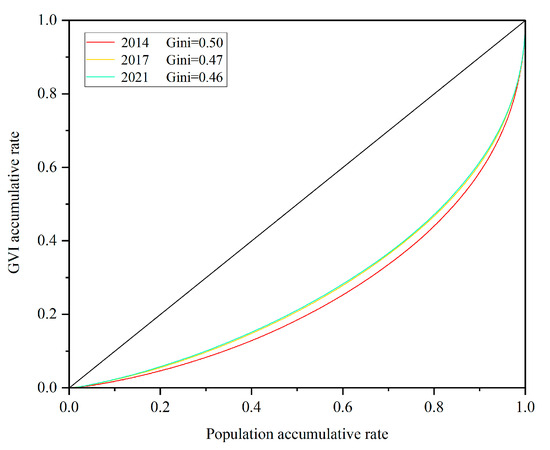 Gini coefficient and the Lorenz curve of Wuhan’s central urban area from 2014 to 2021.
