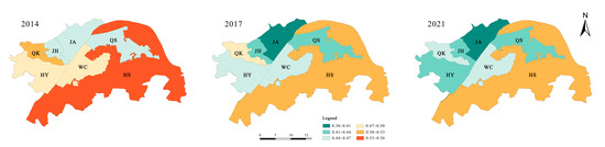 From 2014 to 2021, changes in the Gini coefficient for the central urban area of Wuhan are shown in Figure 7. During these three time points, the Gini coefficient remained within the 0.4–0.5 range, indicating a certain level of inequality in green visibility across the city. There are variations in the equity of green visibility among different districts (Figure 8). The JA District exhibited the highest level of equity, reaching relatively reasonable levels in 2017 and 2021. In contrast, the HS District had the lowest level of equity and was the only district among the seven to experience substantial disparities in resource allocation. The Gini coefficients for all districts showed a downward trend over the two phases, indicating a gradual improvement in equity. However, the rate of decline was relatively slow, suggesting that significant challenges remain in addressing the inequality of green visibility within the region.