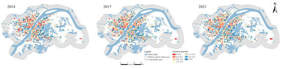 The spatial distribution of the location quotient (LQ) in Wuhan’s central urban area from 2014 to 2021 is illustrated in Figure 9. To precisely analyze the spatial equity of urban green resources, we focused on residential clusters with LQ values less than 0.5 and greater than 2 (indicating that the street green visibility for residents in these areas is half and twice the average level, respectively). Overall, the distribution patterns across the three time points show consistency. Over time, the density of low LQ areas has decreased, while the density of high LQ areas has remained relatively stable. Specifically, the distribution of low LQ areas west of the Yangtze River is roughly the same as the visibility results of the corresponding years, indicating a significant impact of low visibility values on the LQ. In contrast, the distribution east of the Yangtze River is more dispersed, with a notable cluster only in the northwest of East Lake. These low LQ residential clusters generally have a higher population density. Interestingly, some areas with better visibility are also present within these low LQ clusters, suggesting that high population density can negatively impact visibility values, thus affecting green space equity.