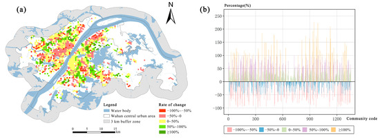 Spatial distribution (a) and change values (b) of location quotient change rates for constant residential units from 2014 to 2021.