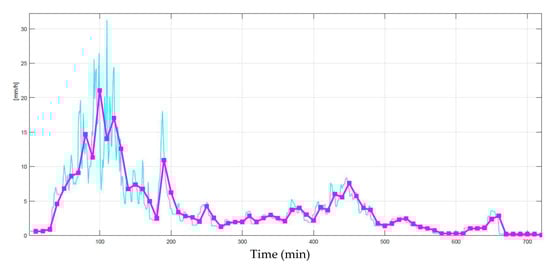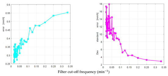 To reduce the noise produced by the simulation steps, is filtered with a low-pass Butterworth filter of order 10 [14,15]—whose performance is very similar to that of the ideal filter—therefore producing . Also, must be scaled to conserve the experimental quantity of the water of the 10 min interval. In conclusion, by filtering and scaling we obtain the final 1 min rain rate time series , according to: