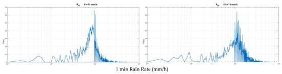In this section, we use the 10-year 1 min rain rate data bank collected in Spino d’Adda to study how the experimental 1 min rain rate time series (mm/h) are connected with the corresponding 10 min time series (mm/h). The latter is generated by , according to the following relationship, applied to disjoint and contiguous 10 min intervals during the rainfall event: