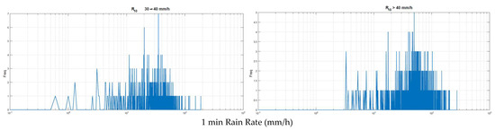 Histograms of in the ranges of mm/h of (left panel) and mm/h (right panel) of .