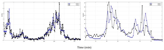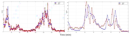 Example of 1 min rain rate time series, measured (blue line, original) and simulated (red line, gener), after filtering and water conservation. (Left panel): a low rain rate event. (Right panel): a high-intensity rain rate event (see also Figure 7).