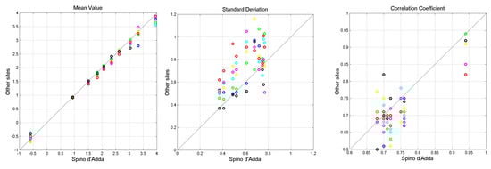 Scatterplots of mean values (left panel), standard deviations (central panel), and correlation coefficients (right panel) between the values of the sites in Table 1 and Spino d’Adda. Gera Lario: green; Fucino: blue; Madrid: cyan; Prague: yellow; Tampa: red; White Sands: magenta; Vancouver: black.