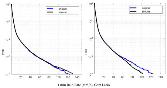 Gera Lario. Probability distribution that the 1 min rain rate in abscissa is exceeded in the experimental data, , blue line, and in the simulated 1 min data, , black line. Left panel: is obtained by using local values of the conditional PDFs. Right panel: is obtained by using Spino d’Adda conditional PDFs (Table 2).