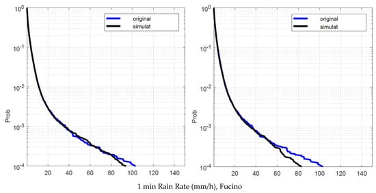 Fucino. Probability distribution that the 1 min rain rate in abscissa is exceeded in the experimental data, , blue line, and in the simulated 1 min data, , black line. Left panel: is obtained by using local values of the conditional PDFs. Right panel: is obtained by using Spino d’Adda conditional PDFs (Table 2).
