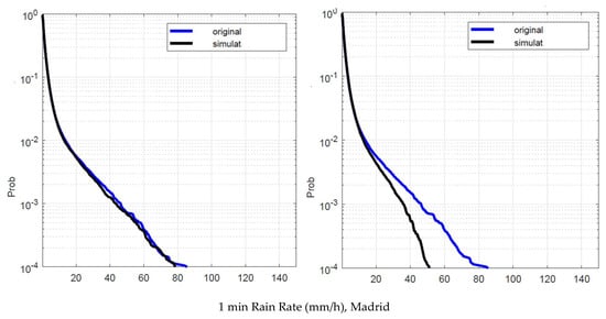 Madrid. Probability distribution that the 1 min rain rate in abscissa is exceeded in the experimental data, , blue line, and in the simulated 1 min data, , black line. Left panel: is obtained by using local values of the conditional PDFs. Right panel: is obtained by using Spino d’Adda conditional PDFs (Table 2).