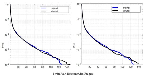 Prague. Probability distribution that the 1 min rain rate in abscissa is exceeded in the experimental data, , blue line, and in the simulated 1 min data, , black line. Left panel: is obtained by using local values of the conditional PDFs. Right panel: is obtained by using Spino d’Adda conditional PDFs (Table 2).